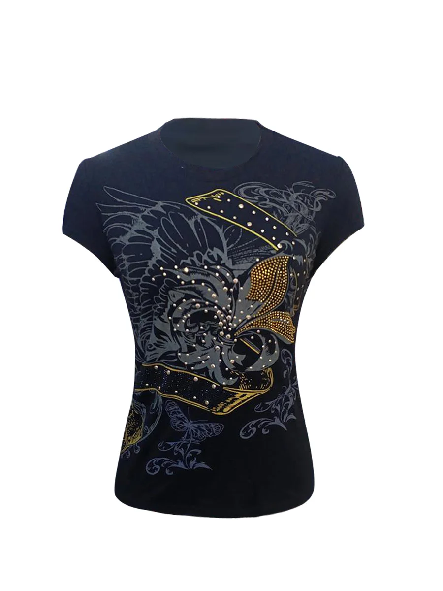 Women’s Grunge Rhinestone Tops Vintage Short Sleeve Round Neck Wings Print T-Shirts Blouses